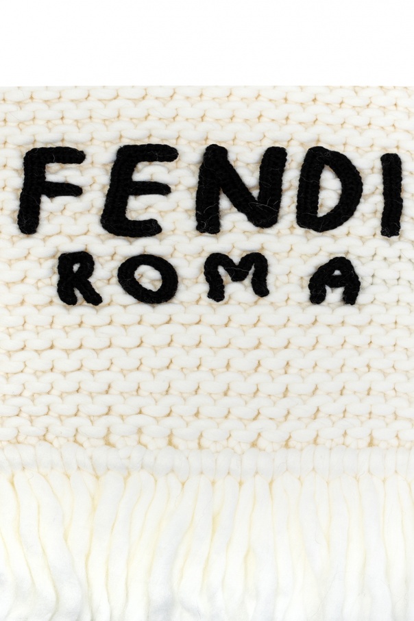 White scarf from Fendi. Knitted from wool with the brand's logo in black, this scarf showcases two fringed edges.
