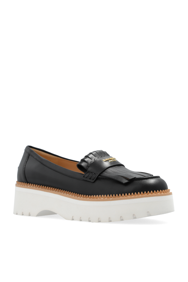 Introducing the quintessence of modern sophistication: the Kate Spade 'Caddy' Loafers. Crafted with meticulous attention to detail, these loafers exude a blend of timeless elegance and contemporary flair. The dominant black hue, complemented by a classic low-profile silhouette, makes these shoes a versatile addition to any discerning wardrobe. The hallmark of these loafers is their distinctive, wide strap adorned with a subtle designer logo, signaling luxury and exclusivity. The exterior, fashioned from 100% premium leather, boasts a smooth and lustrous finish, indicative of high-quality craftsmanship. The interior, also lined with leather, ensures comfort and durability, making these shoes not just a statement of style but a testament to luxury wear. Setting these loafers apart is their striking, two-tone platform sole crafted from 100% rubber. This feature not only adds a bold, modern edge to the classic design but also provides enhanced grip and comfort, making them ideal for navigating the urban landscape. The contrast between the black leather and the dual-hued sole, punctuated by distinctive stitching, encapsulates contemporary elegance. Why Purchase the Kate Spade 'Caddy' Loafers? Elegant Design: Classic loafers silhouette with a modern twist. Premium Materials: Crafted from 100% leather, ensuring luxury and longevity. Distinctive Sole: Two-tone rubber platform sole for a bold aesthetic and comfort. Designer Signature: Discreet logo accentuates the exclusivity of the design. Versatile Style: Perfect for elevating both casual and formal ensembles.