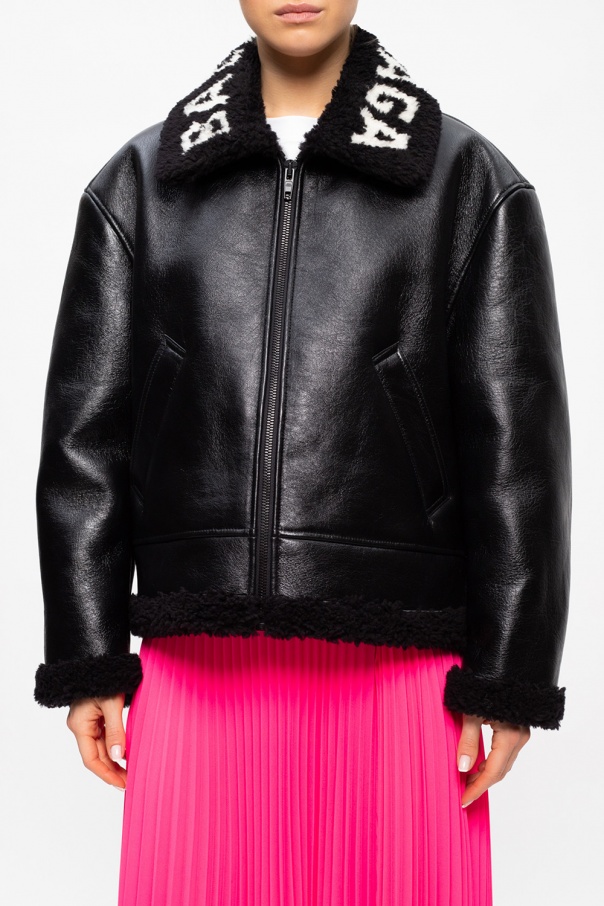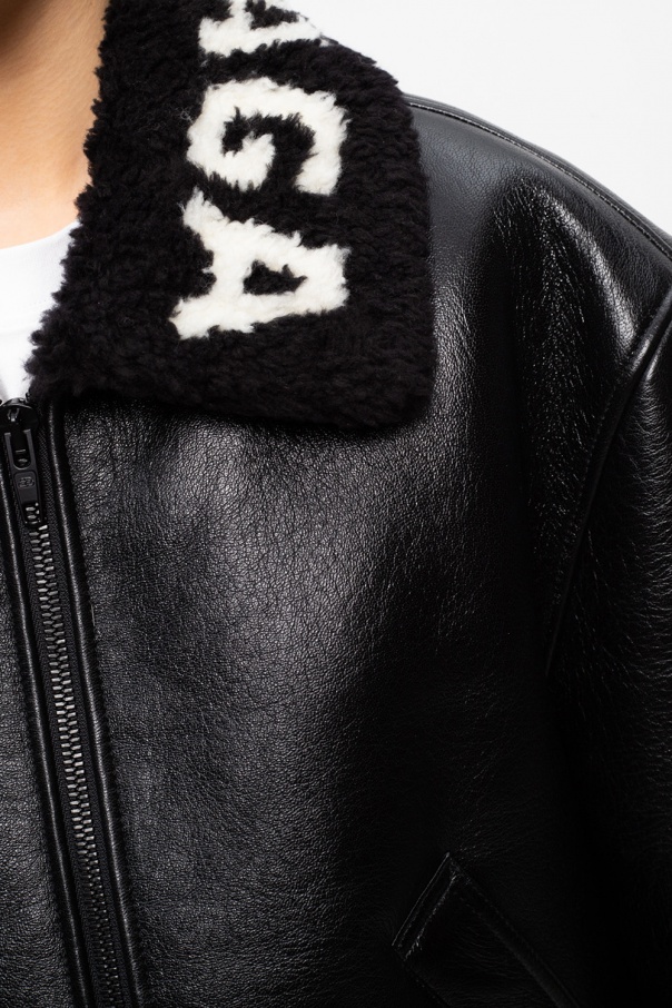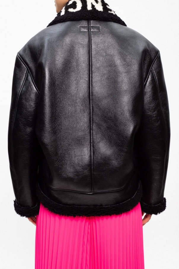 Black jacket from Balenciaga. Distinguished with a contrasting white intarsia Balenciaga logo on the collar, this lamb leather-crafted style fastens via a zip and features shearling details and two welt front pockets.