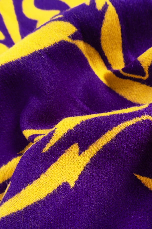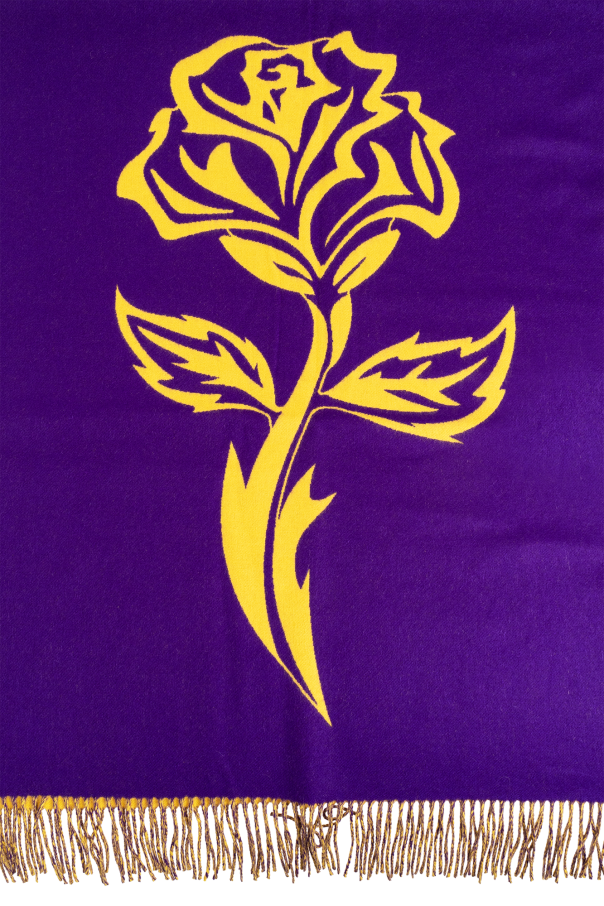 Purple and yellow scarf from Burberry. Made of cashmere, this item showcases the brand's logo, a motif of a rose and fringed edges.