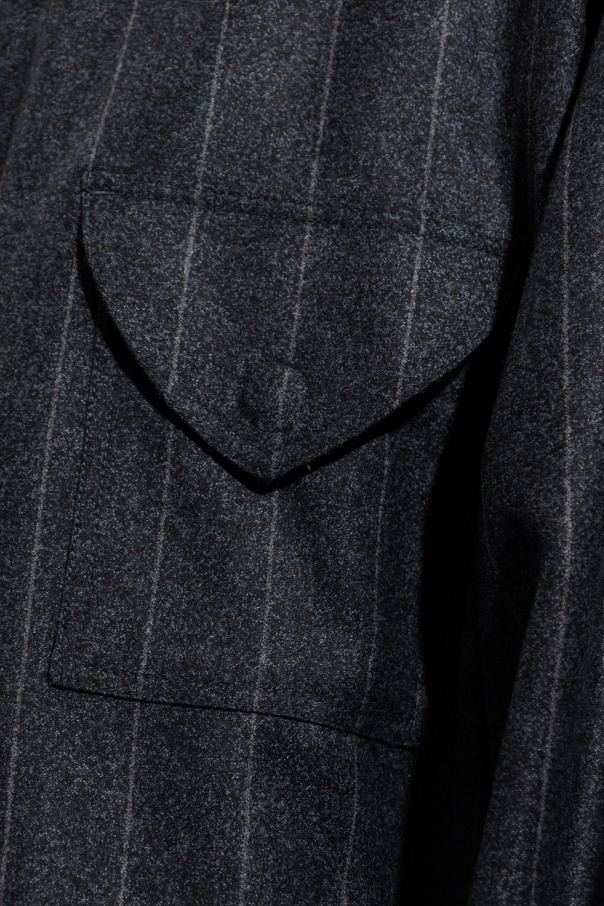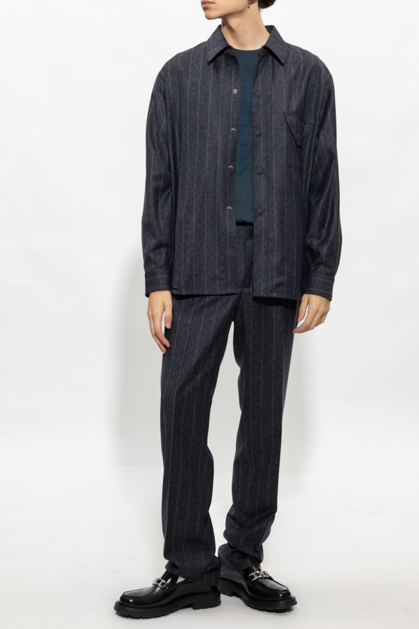 Navy set shirt and trousers set with a grey pinstripe pattern from Giorgio Armani. The shirt features snap buttons with a concealed placket, snap-fastened flap pocket, side vents and long sleeves with snap-fastened cuffs. The trousers feature a zip, hook and button, two slip pockets, one buttoned flap pocket, slightly tapered legs with pleats and two buttoned back pockets.