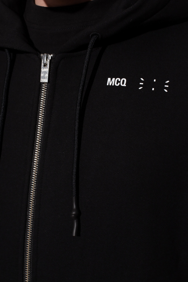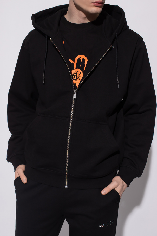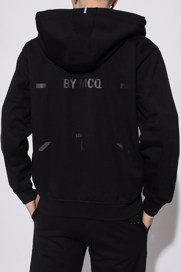 Black hoodie from No. 0 by McQ. Made of cotton, this garment features a white print, black and blue logo patch, drawstring hood, two slip pockets and ribbed trims at the hem and cuffs.