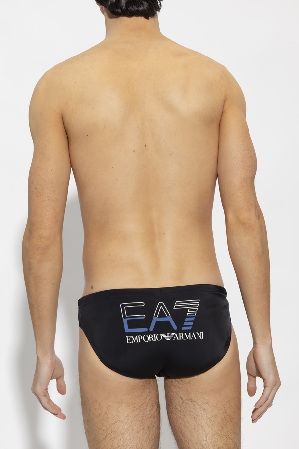 Black swim briefs from EA7 Emporio Armani. Fastened with drawstrings, this pair is decorated with a logo print in white and blue.
