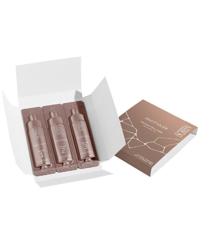 Эффективность восстанавливающей процедуры Screen Repair обусловлена содержанием интенсивного кератинового комплекса. Это эксклюзивная смесь из 20 аминокислот. Система Восстановление Поврежденных Волосы Трехшагкая состоит из:
