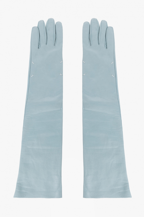 Long gloves in light blue from Maison Margiela. Crafted from sheep leather, this pair features the brand's signature white four stitches moniker.