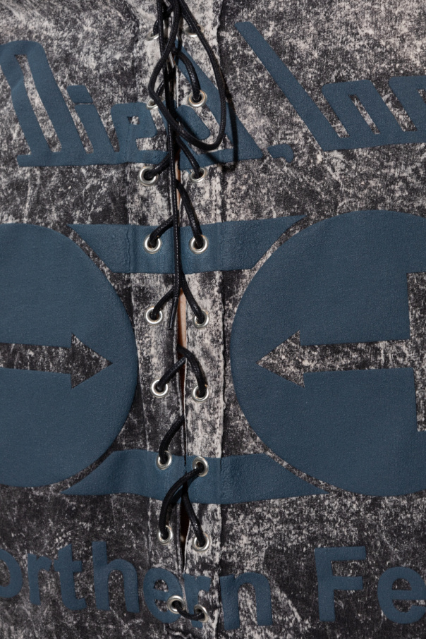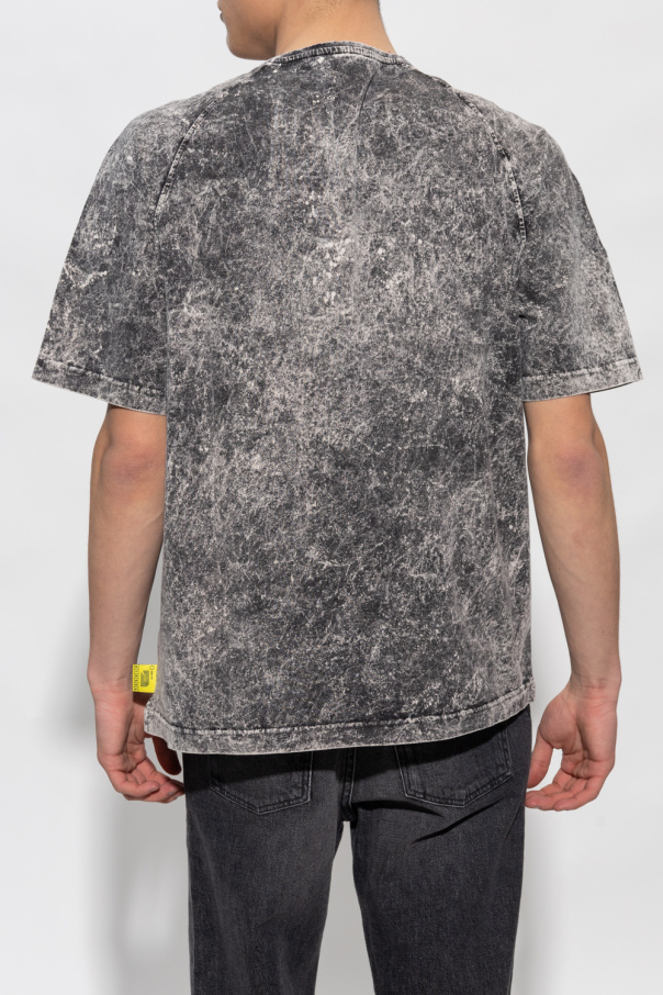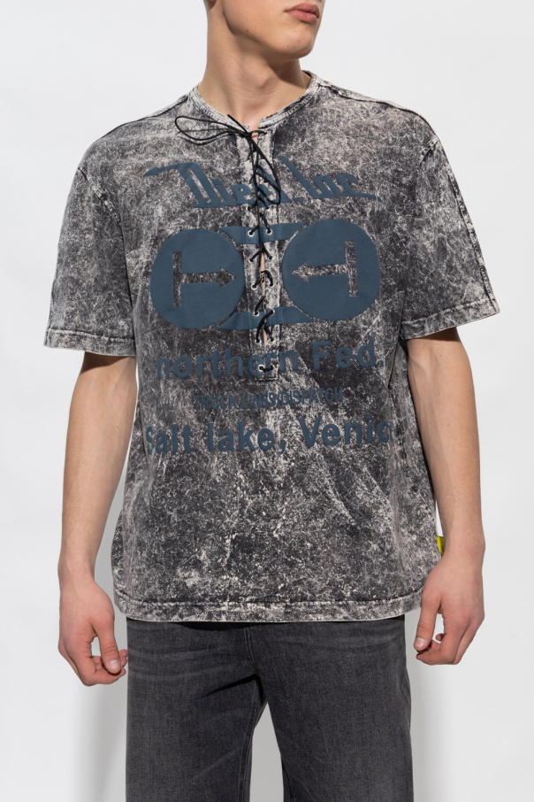 Black and grey ‘T-XYLO’ T-shirt from Diesel. Made of cotton, this style showcases a drawstring V-neckline, short sleeves and a navy blue logo print and graphic pattern.