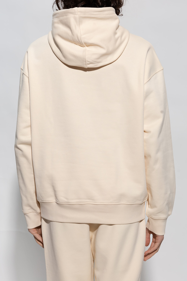 Cream hoodie from Lacoste. Made of cotton, this design features a logo patch and print, drawstring hood, slip pocket and ribbed trims at the hem and cuffs.