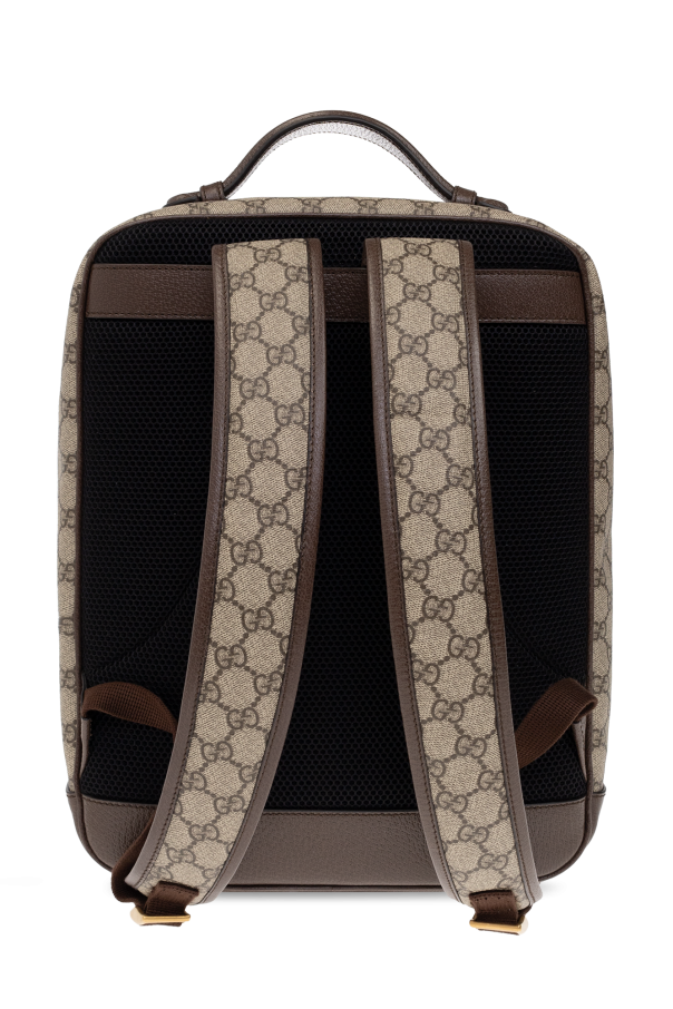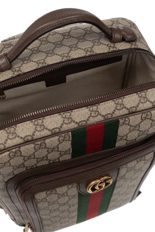 Beige and brown ‘Ophidia GG Medium’ backpack from Gucci. Made of GG Supreme and leather, this model features a black back with perforated fabric, two-way zip fastening, metal logo detail, green and red Web stripes, zip pocket, half-round handle, adjustable shoulder straps and metal hardware in antique gold-tone. It has one internal compartment with one zip pocket and one slip pocket.