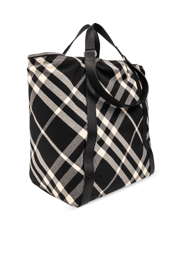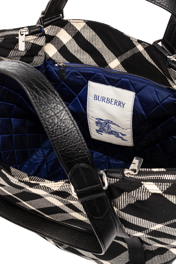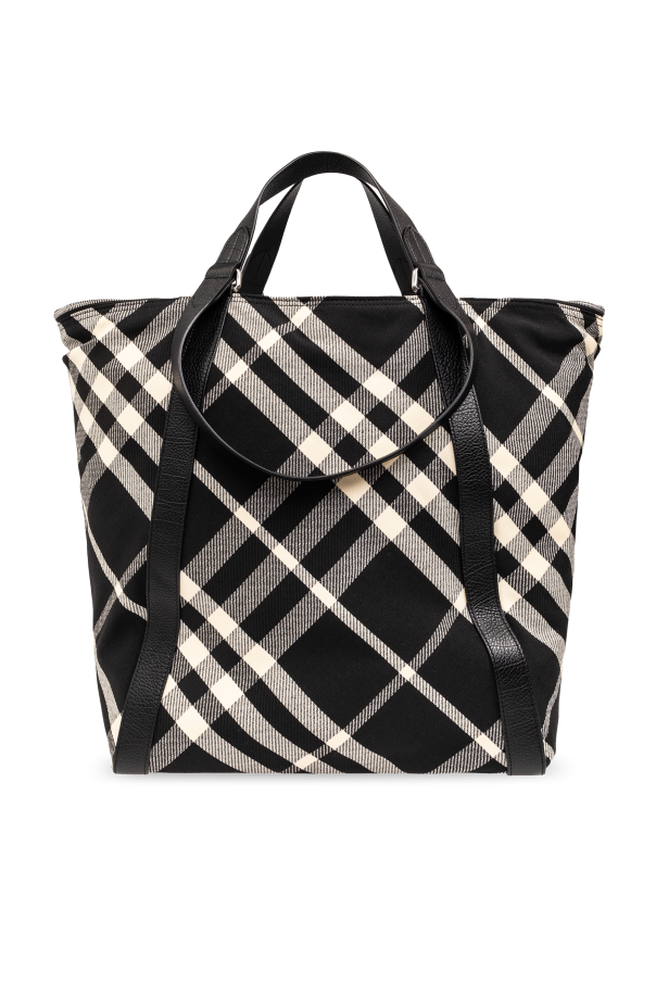 Introducing the quintessence of sophistication and utility: the Burberry Black and Cream 'Shopper' Bag, adorned with the iconic check pattern. This meticulously crafted piece combines functionality with timeless style, making it an unparalleled accessory for the discerning fashion enthusiast. Crafted from a durable blend of cotton and polyester, and elegantly trimmed with calf leather, this bag promises to stand the test of time while maintaining its luxurious appeal. The classic black and white check pattern exudes a bold and fashionable statement, complemented by solid black handles that ensure a comfortable grip, even when carrying heavier items. The interior, lined with poliamid, reveals a thoughtful design featuring additional pockets for superior organization, along with a zipper pocket to secure your valuables. The presence of a designer logo label within attests to its authentic craftsmanship and attention to detail. Unique features such as side pockets with zipper closure and four sturdy handles enhance its practicality without compromising style. Silver metal finishings add a touch of elegance, culminating in a bag that is not only an emblem of luxury but also an embodiment of practical sophistication. Why Purchase This Product? Exclusively designed by Burberry, a testament to high-quality craftsmanship and luxury. Durable materials including cotton, polyester, calf leather, and poliamid lining ensure longevity. Iconic check pattern and silver metal finishings offer a timeless elegance. Practical design with multiple pockets for enhanced organization and space. Perfect fusion of style and functionality suited for every occasion.