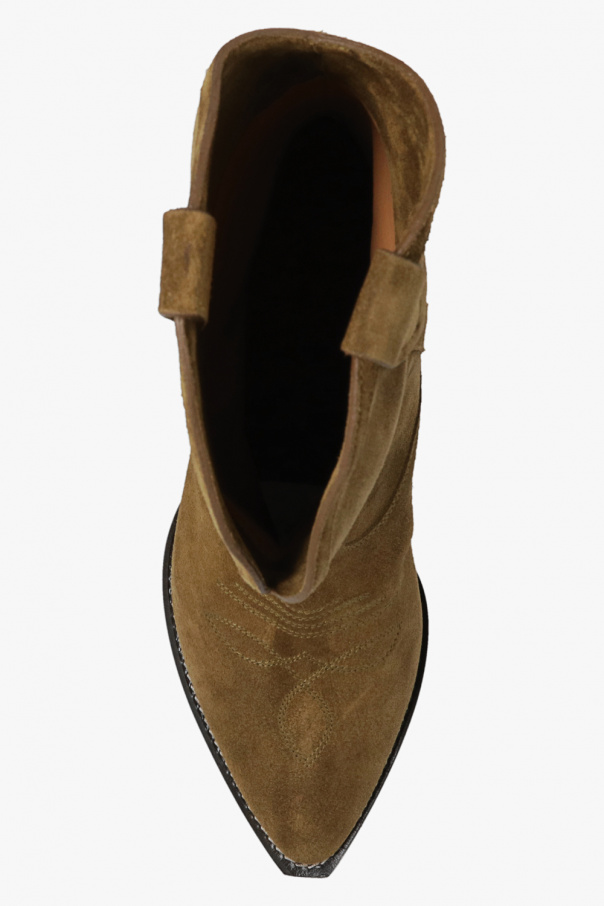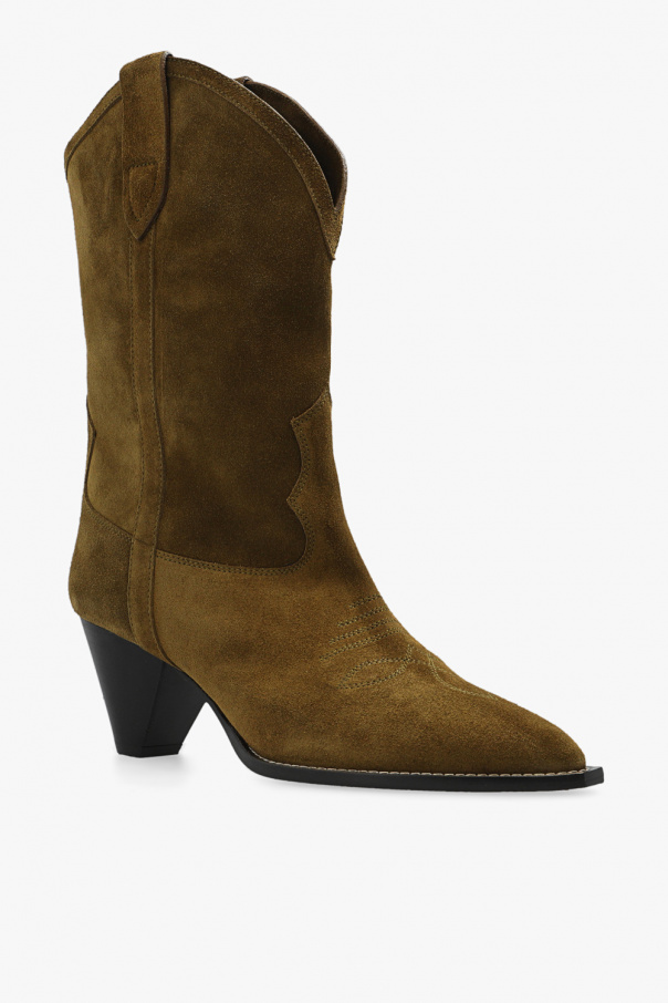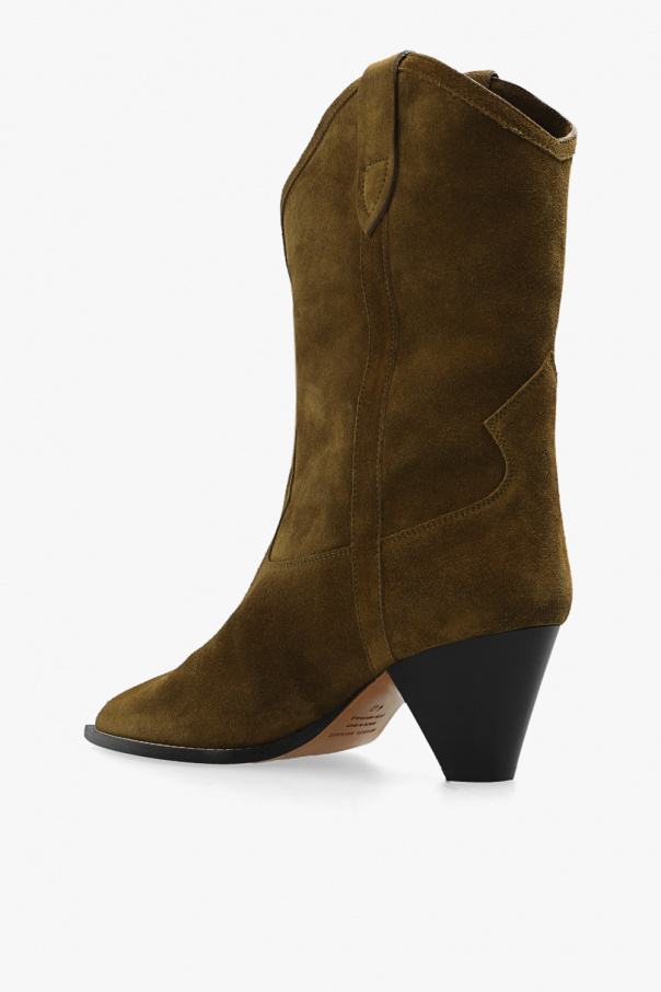 Khaki ‘Luliette’ heeled ankle boots from Isabel Marant. Made from calf suede with a slip-on silhouette, this model sits on a beige and black leather sole and features a tapered toe and exposed stitching details.