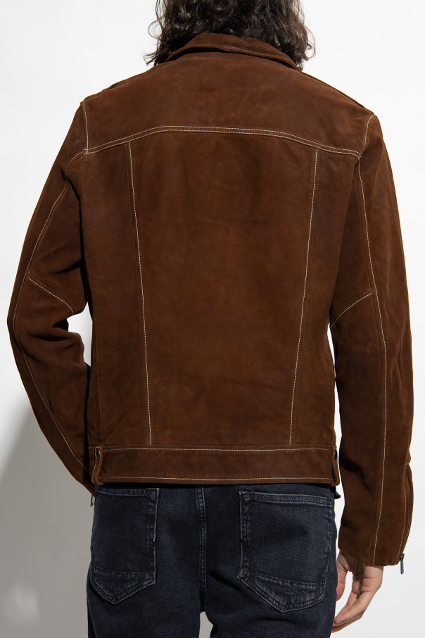 Brown ‘Milo’ suede jacket from AllSaints. Made of goat suede, this garment features a two-way zip, contrasting stitching in white, snap fastenings at the collar, belt loops and pocket as well as two pockets and cuffs with zips.