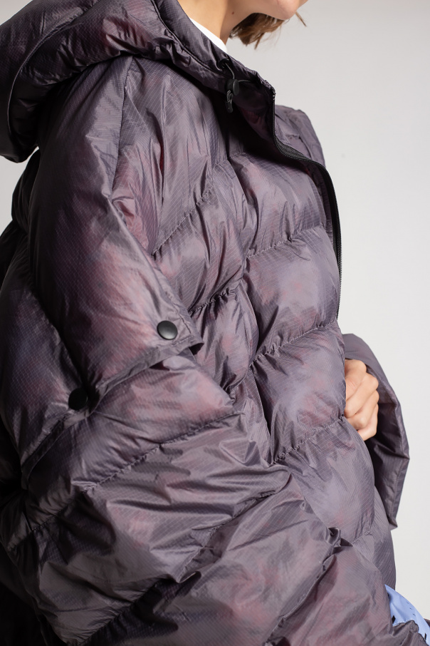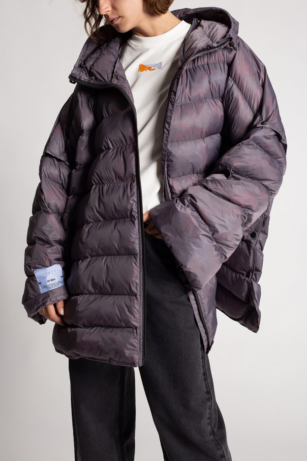 Grey quilted jacket with a drawcord-adjustable hood from Breathe by McQ, the ‘No. 7’ collection. Fastened with a zip, this style features snap closures on the sides and detachable sleeves, one of which has a logo patch.