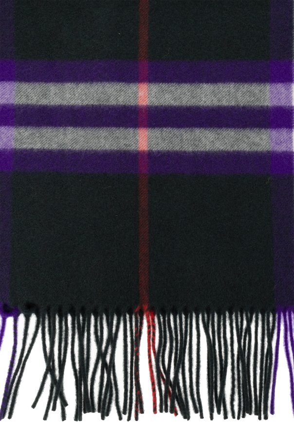 Dark green scarf from Burberry. Made of cashmere, this item showcases the brand's signature colourful check pattern and fringes on the edges.