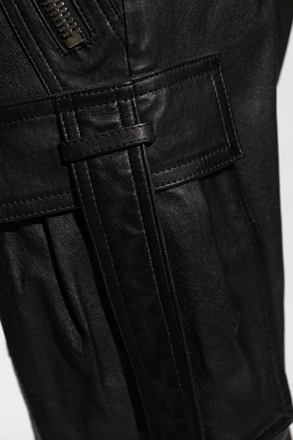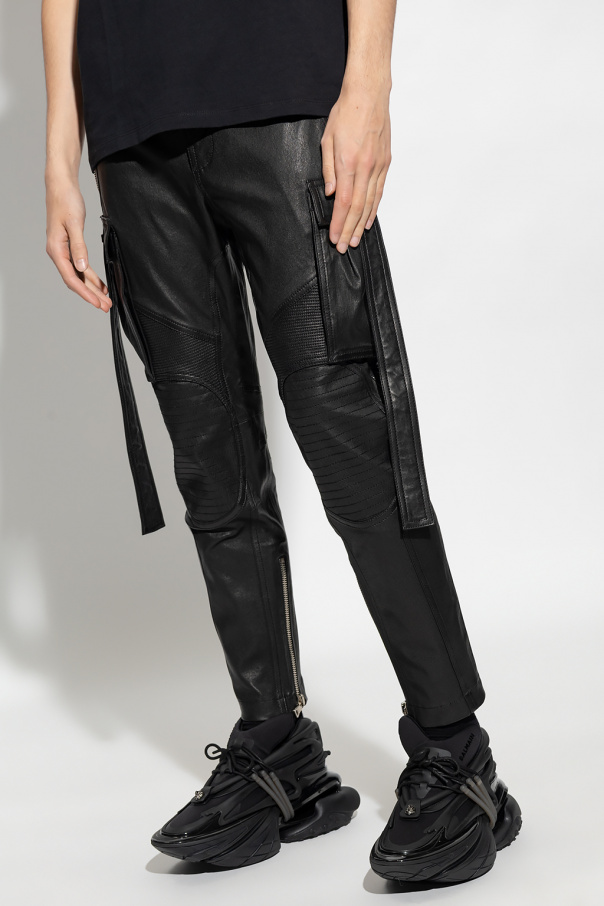 Black trousers from Balmain. Crafted from lamb leather, this pair falls to tapered legs and features a zip fly, a drawstring waistband, topstitched detailing, patches, multiple slip and zipped pockets, two flapped pockets with straps and zipped vents on the cuffs.