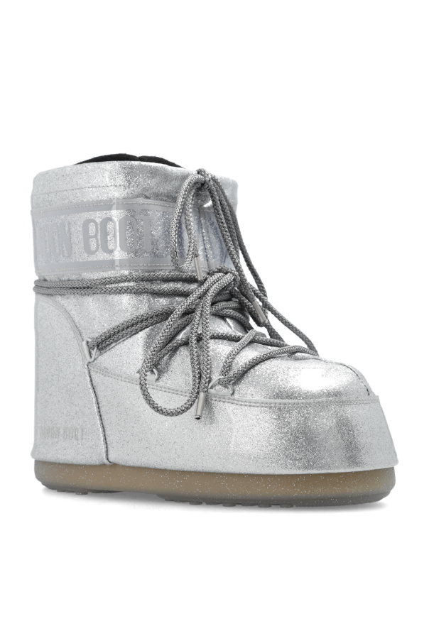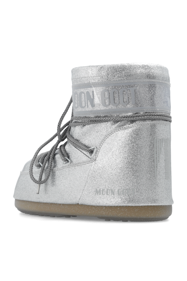 Silver-tone ‘Icon Glitter’ snow boots from Moon Boot. Spruced up with glitter, this waterproof model sits on a grey tread rubber sole with suction cups to ensure superb grip on any surface and showcases the brand's logo, silver-tone metal hardware, elastic crisscross tube laces (do not use them to pull off shoes) and an elasticized hem. Inspired by the peculiar shape and technology of the astronauts’ boots, the iconic style was designed in 1969 after the first Moon landing.