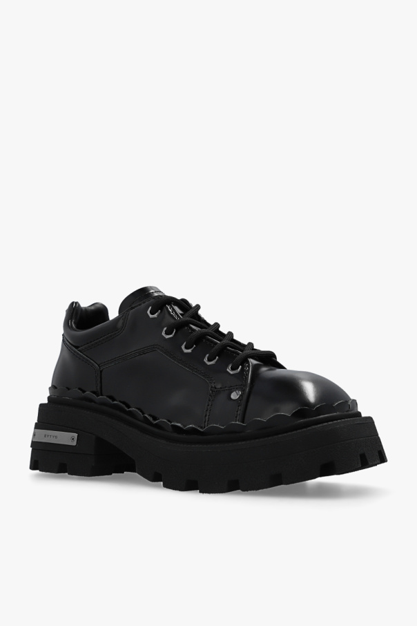 Black ‘Detroit’ shoes from Eytys. Crafted from smooth leather, this lace-up model sits on a black chunky rubber sole accentuated with a silver-tone metal logo plaque and features a rubber logo application on the tongue and decorative details on the upper.