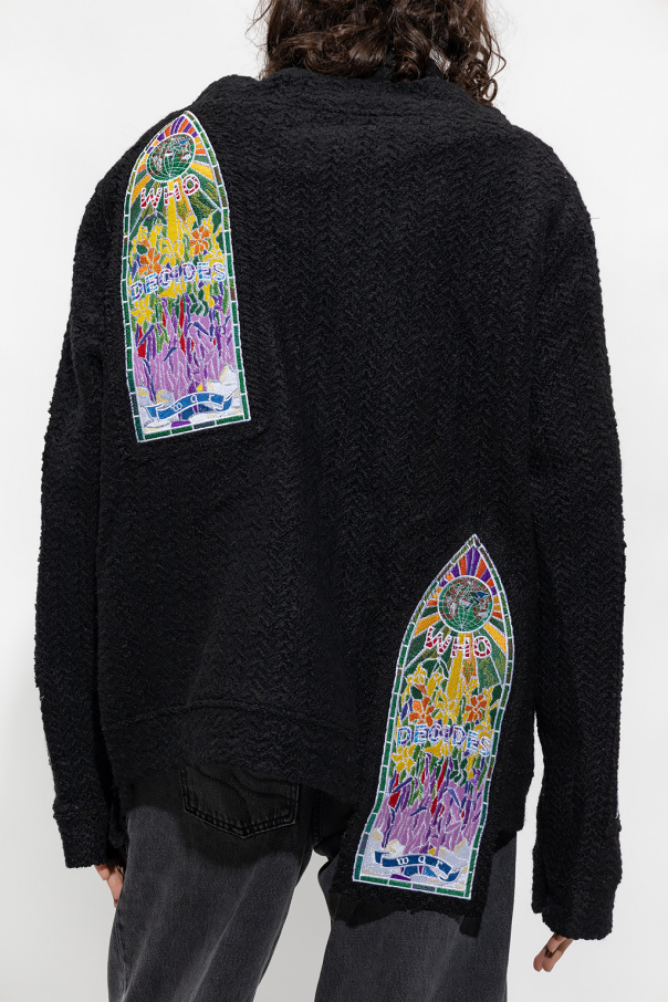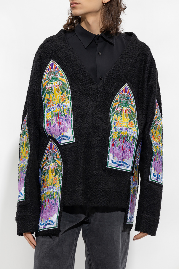 Black sweater with long sleeves from Who Decides War. This asymmetric design features multicolored logo patches inspired by stained glass and ribbed trims at the neck, hem and cuffs.