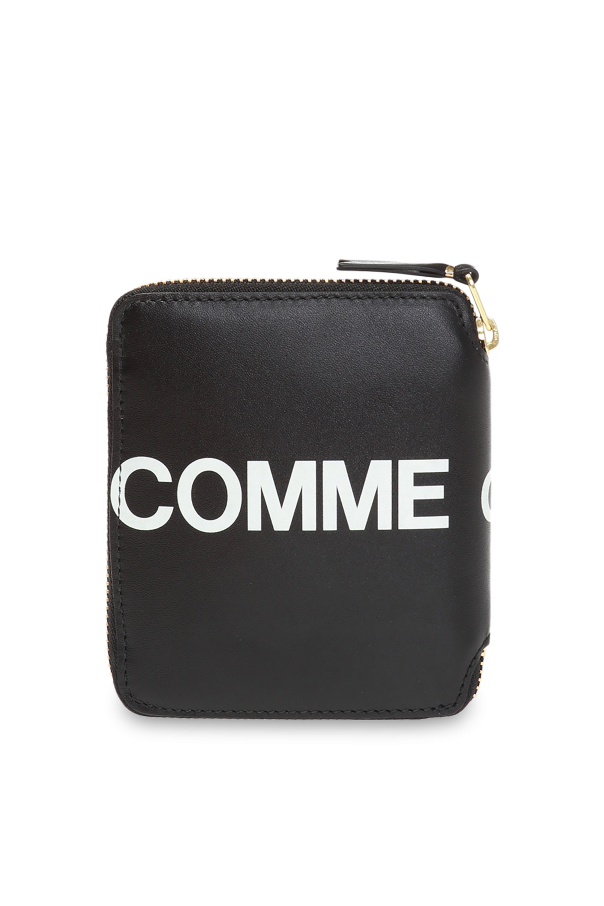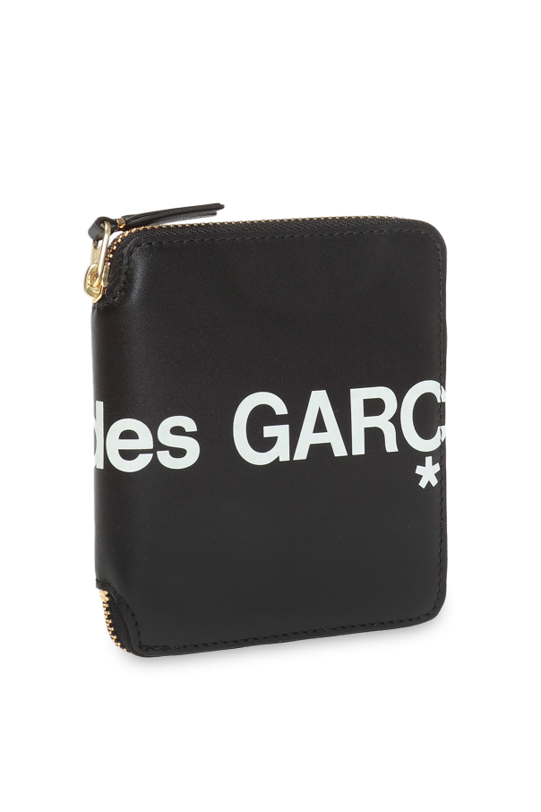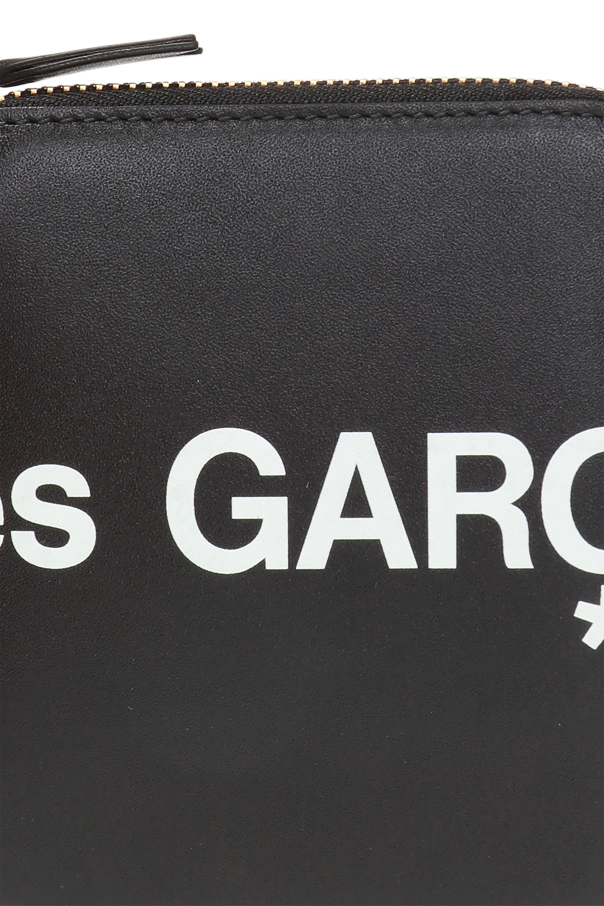 Black wallet from Comme des Garçons. Made of leather. Fastened with zip. Embellished with printed white branding. It features a bills compartment, 1 snap-fastened coins pocket, 1 slip pocket and 4 card slots inside.
