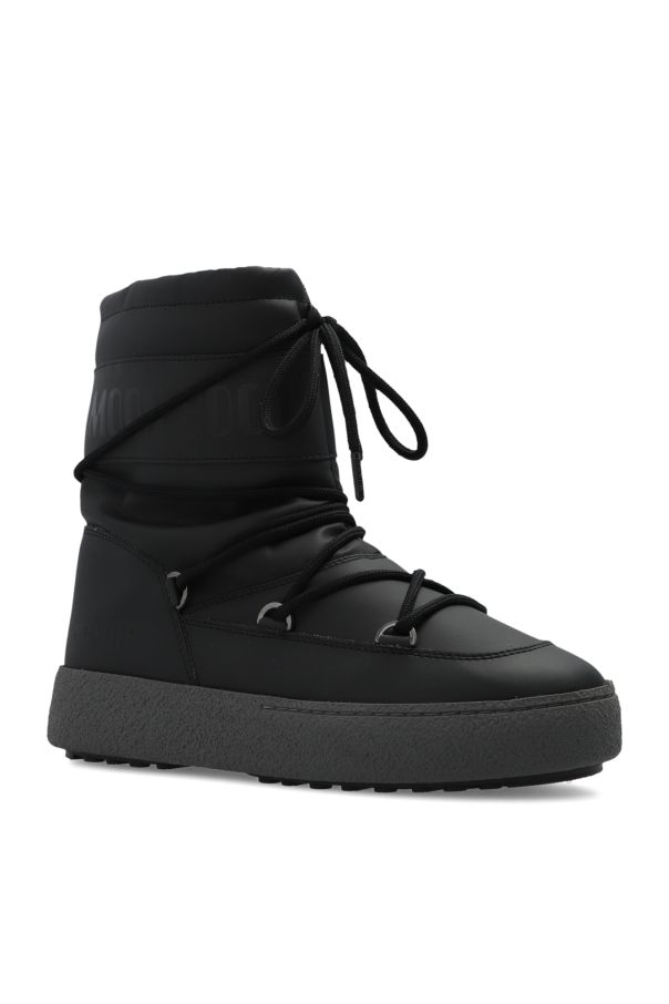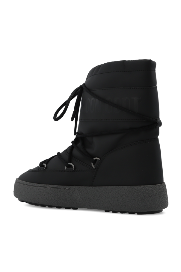 Black ‘MB Ltrack’ snow boots from Moon Boot. Made of rubber, this pair features a sits on a grey and black rubber sole with suction pads for increased grip and has double lacing on the front. Inspired by the peculiar shape and technology of the astronauts’ boots, the iconic style was designed in 1969 after the first Moon landing.