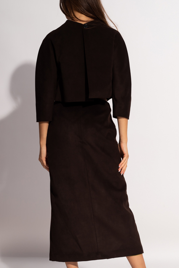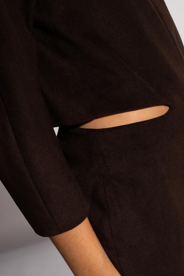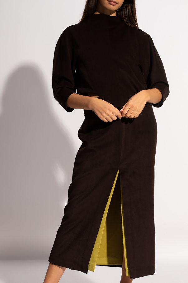 Brown dress from Proenza Shoulder. Fastened with buttons at the back, this round neck design features a side zip, decorative cut-outs, green lining, slit on the front and 3/4 length sleeves.