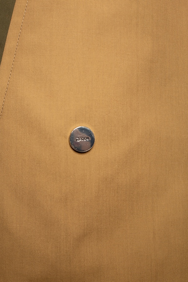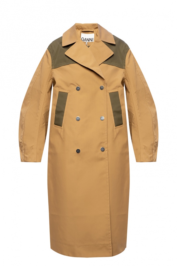 Beige and green coat from Ganni. Cut from cotton blend, this double-breasted design fastens via silver-tone snap buttons engraved with the label's logo and employs long sleeves and a single back vent.