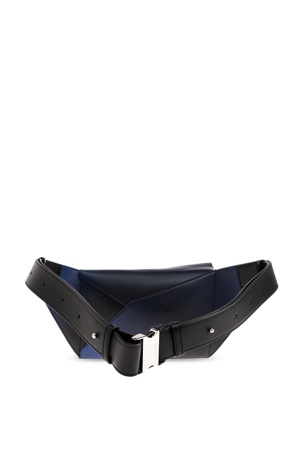 Navy blue and black ‘Puzzle Edge’ belt bag with a gradient effect from Loewe. Made from calf leather, this design fastens via a zip and showcases an embossed logo, asymmetrical patches, one zip pocket on the front, silver-tone metal hardware as well as an adjustable strap and one internal compartment with a slip pocket.