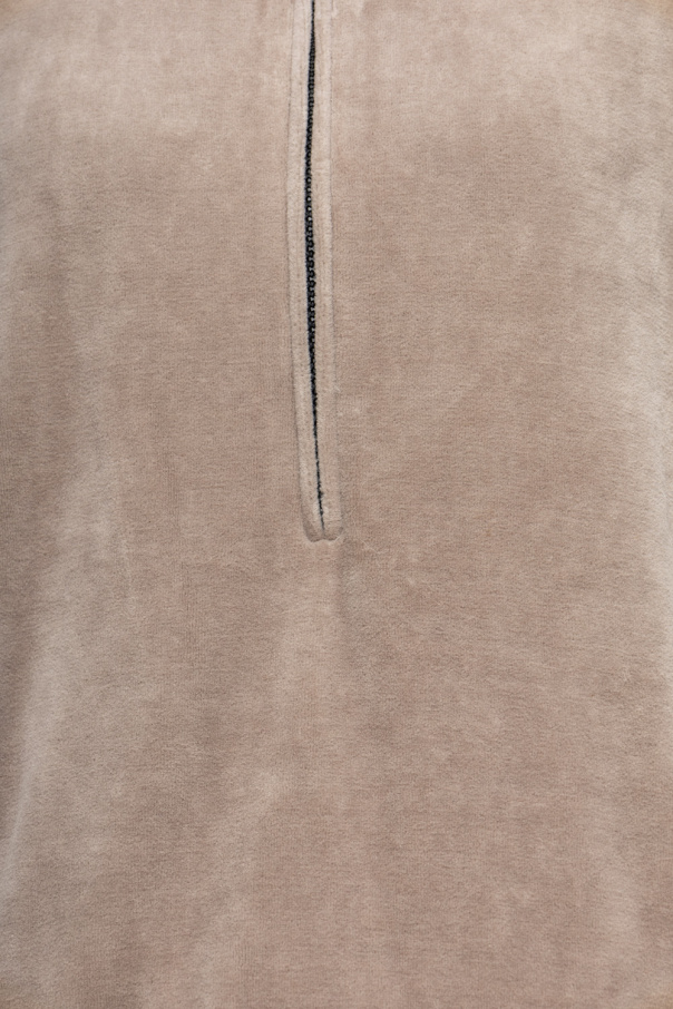 Greyish brown sweatshirt from Fear Of God Essentials. Made of a cotton blend with a velour finish, this garment features a zipped high neck, the label’s signature rubber logo patch, two slip pockets, short sleeves and ribbed hem.