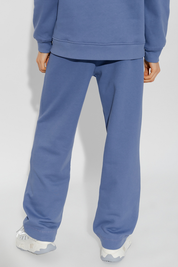 Greyish blue sweatpants from Ganni. Crafted from organic cotton with a high-rise waist, this pair falls with straight legs and features a drawstring waistband, logo embroidery on the front, two side seam pockets and one decorative pocket at the back.
