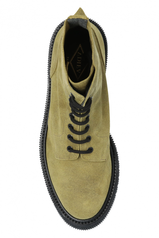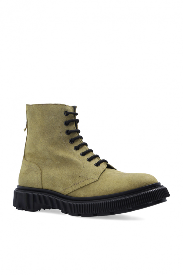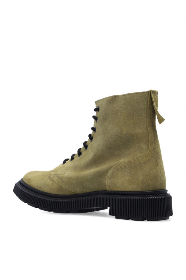 Green ‘Type 165’ boots from Adieu Paris. Made of suede, this almond toe pair rests on a black rubber sole.