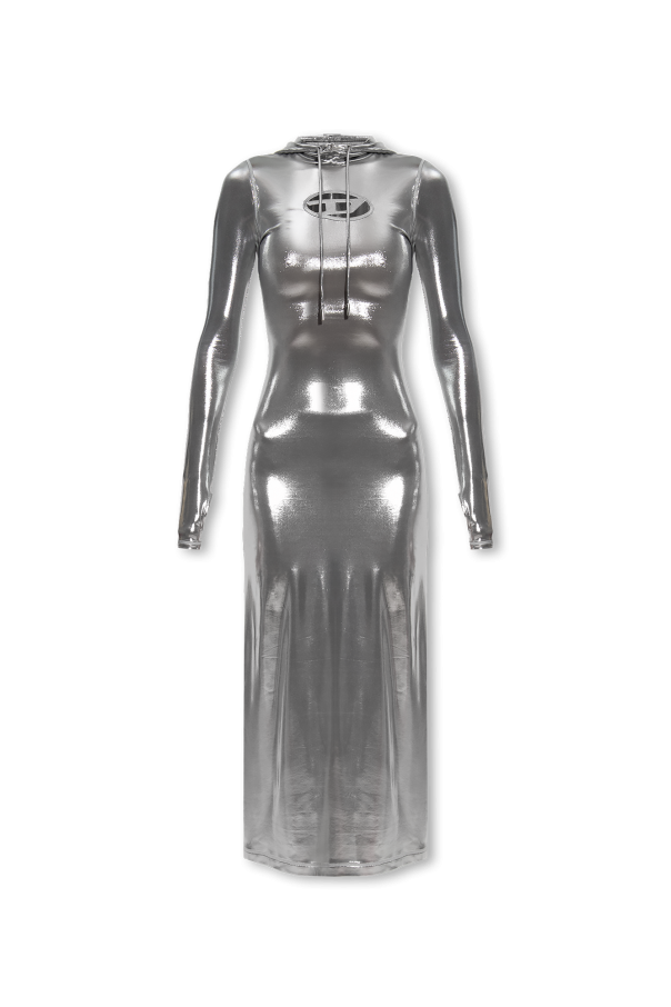 Silver-tone ‘D-MATHILDE’ maxi dress with a drawcord-adjustable hood from Diesel. Crafted in stretchy material with a form-fitting silhouette, this style features cutout detailing with a logo on the front and long sleeves with thumbholes.