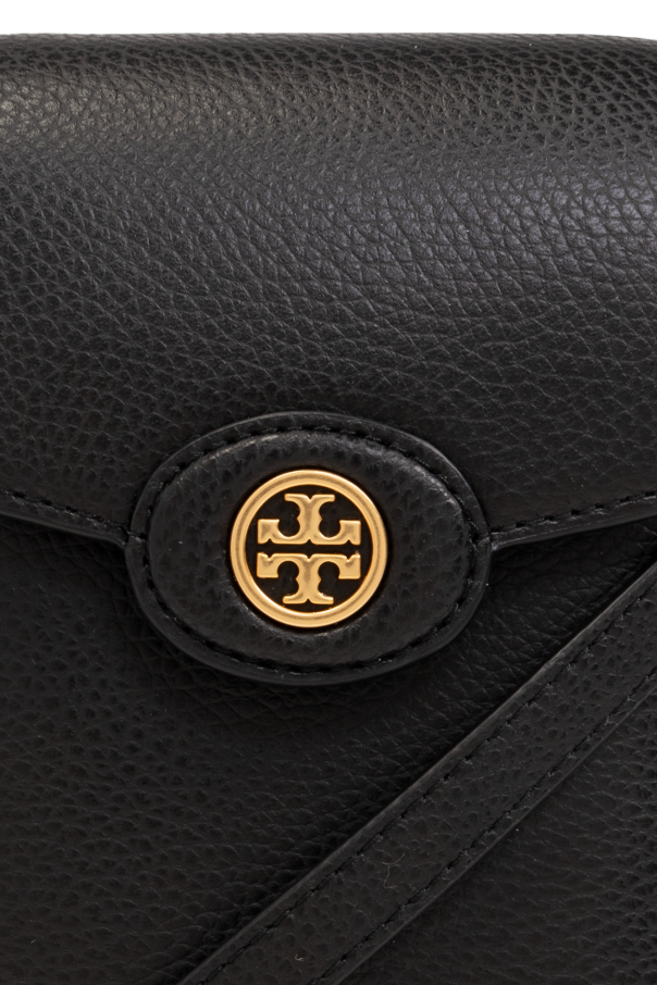 Black ‘Robinson’ phone pouch from Tory Burch. Made of grained leather, this design features a magnetic closure with a metal logo detail, back pocket, adjustable strap, gold-tone metal hardware and one internal compartment with two card slots.