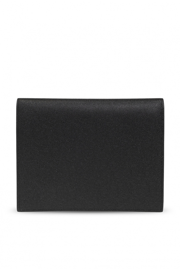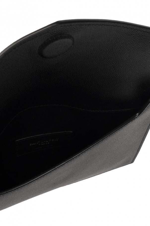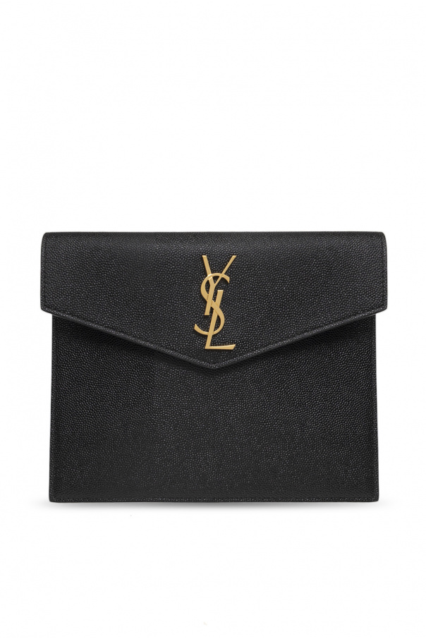 Black ‘Uptown Baby Small’ clutch from Saint Laurent. Crafted from grain calf leather, this model features a magnetic snap, metal logo appliqué in gold-tone and one internal compartment.