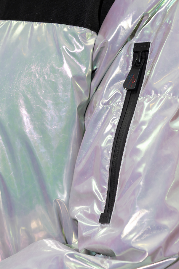 Silver-tone ‘Rennaz’ ski jacket with holographic effect from Moncler Grenoble. Fastened with a two-way zip, this breathable, water- and windproof garment features a logo patch, detachable hood with fleece and stand collar with snaps and velcro, two pockets with waterproof zips, long sleeves with ribbed cuffs with velcro fastenings and thumb holes and drawstring hem with snap-fastened ribbed lining.