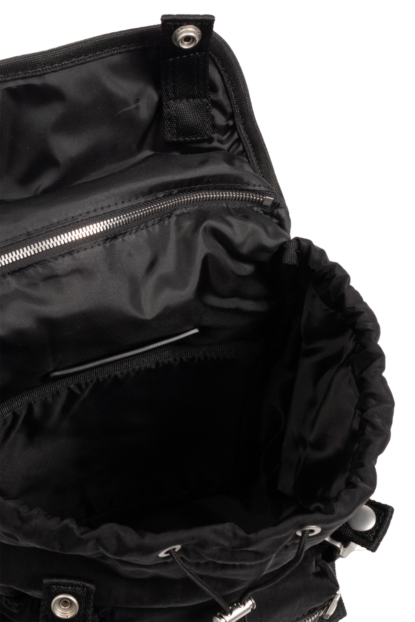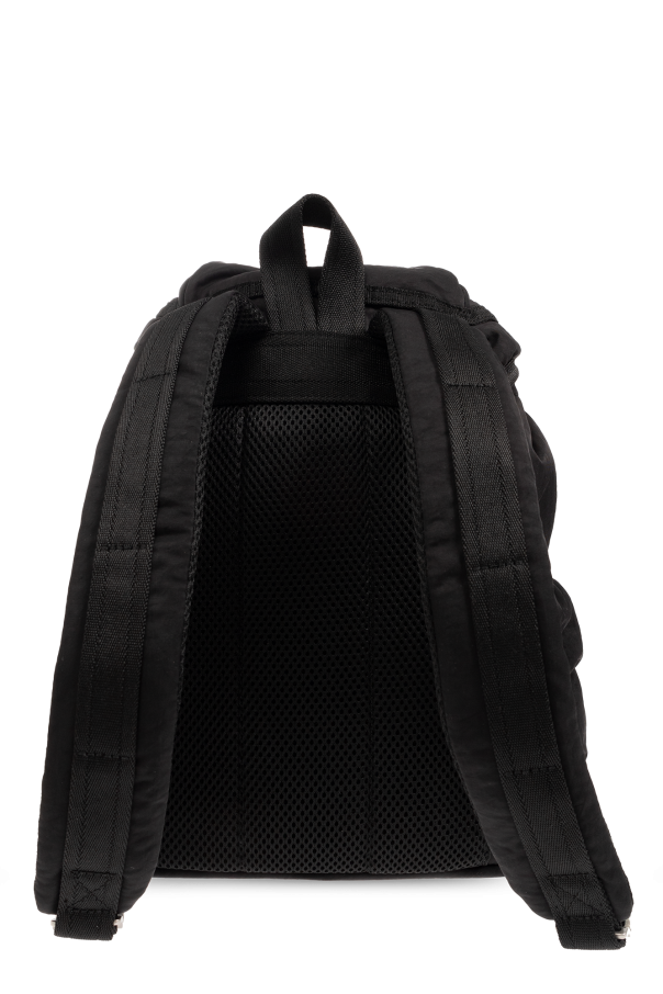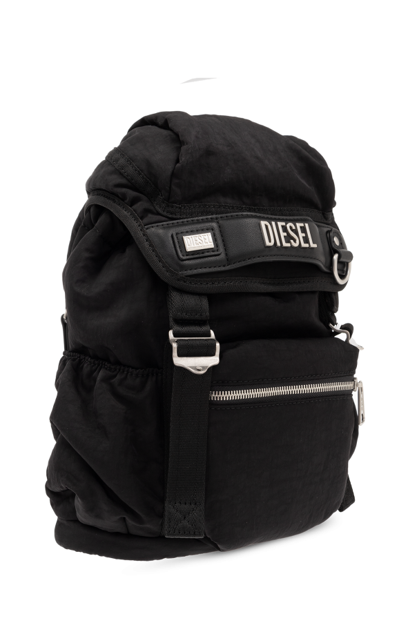 Black ‘LOGOS SMALL’ backpack from Diesel. Featuring a faux leather strap with a metal logo on the front, this design is complete with straps with snap closures, zip pockets on the front and back, slip pockets on the sides, a top handle, adjustable shoulder straps, one zip pocket on the underside of a flap, silver-tone metal hardware and a drawstring interior with one compartment and one slip pocket.