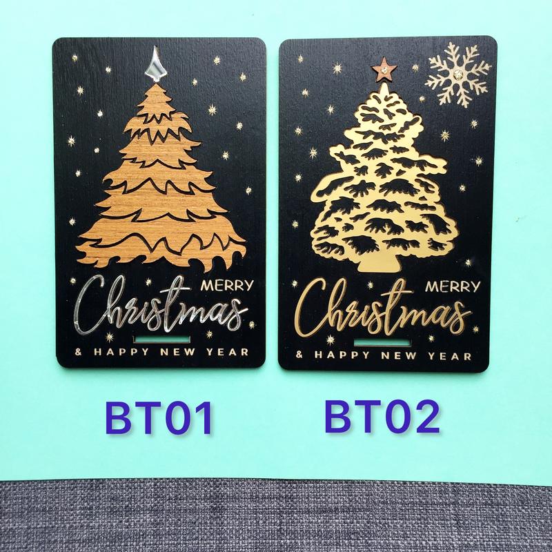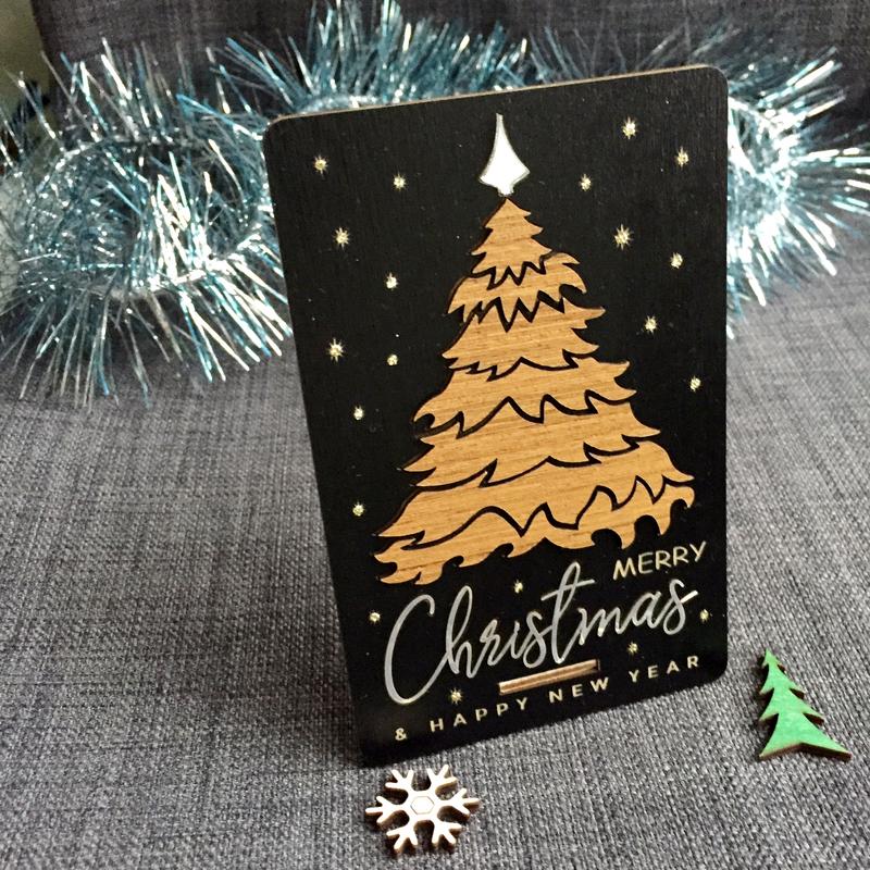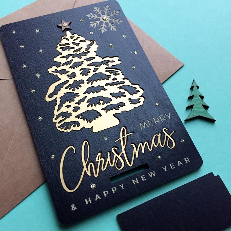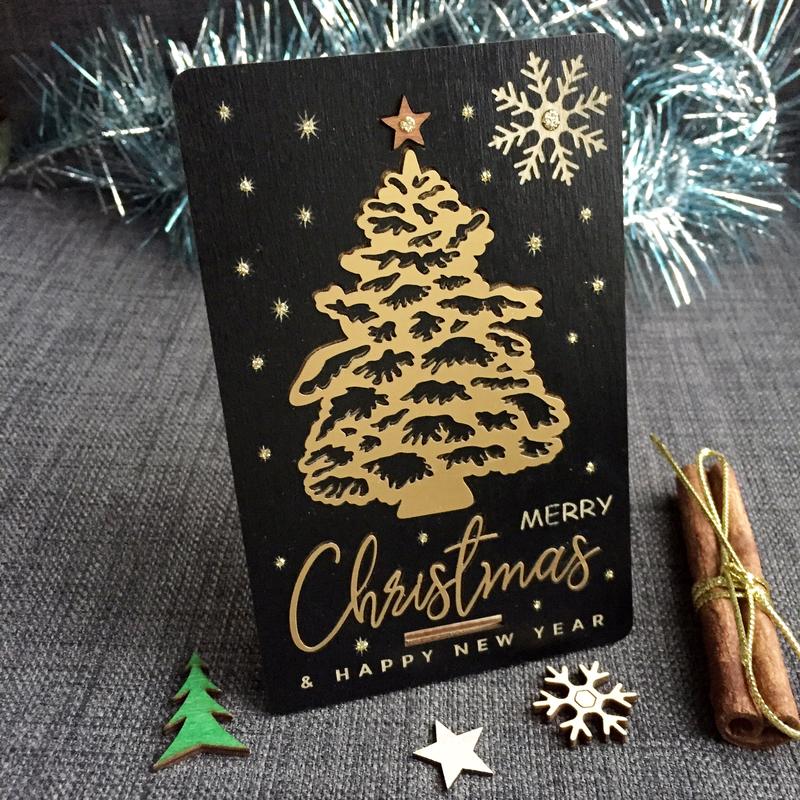 1. Эко деревянный шпон тыка, серебряная зеркальная верхушка на елке, снежинки точечной золотистой росписью, Рождество – серебряный голографический картон