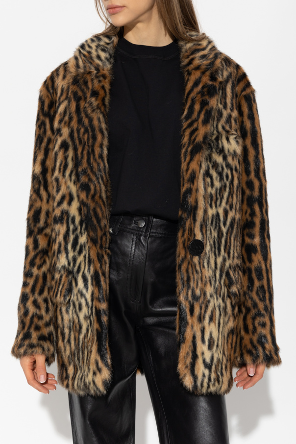 Brown and black ‘Jumbo’ jacket from Stand Studio. Crafted from faux fur, this garment features hook fastenings, two flap pockets and one slip pocket.