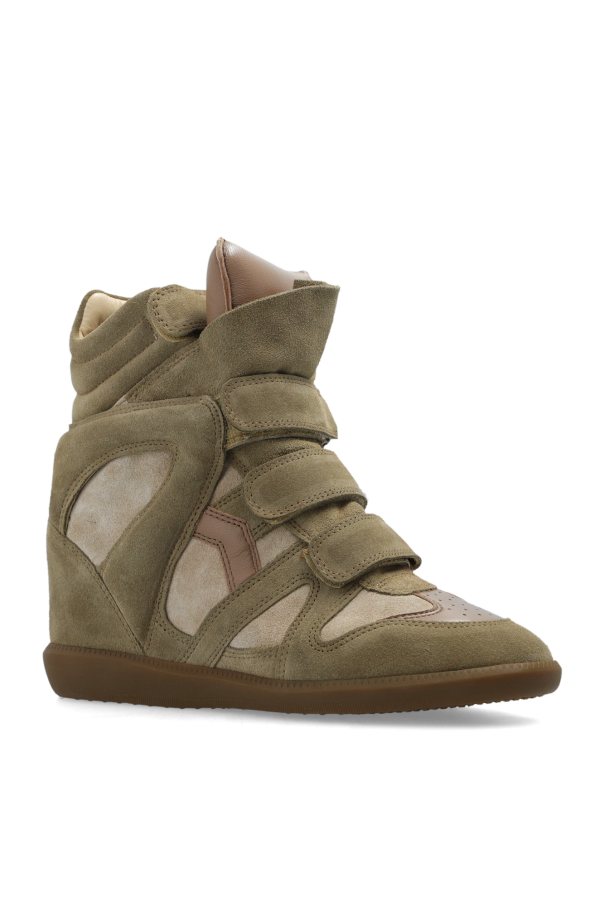 Khaki, brown and grey ‘Bekett’ wedge boots from Isabel Marant. Made of suede and leather, this pair features velcro fastening, a quilted heel counter, perforated front and brown rubber sole.