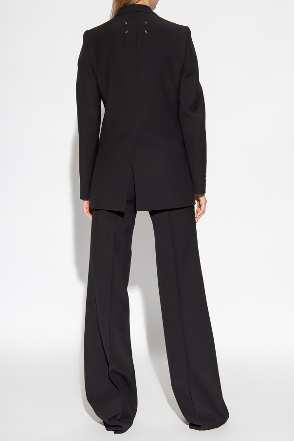 Black suit from Maison Margiela. Made of wool. The blazer has notch lapels with buttons, three front pockets, long sleeves and single rear vent. The pleat-front trousers feature a zip and hook closure, two front pockets, two back pockets, the brand’s signature white stitching and straight legs.