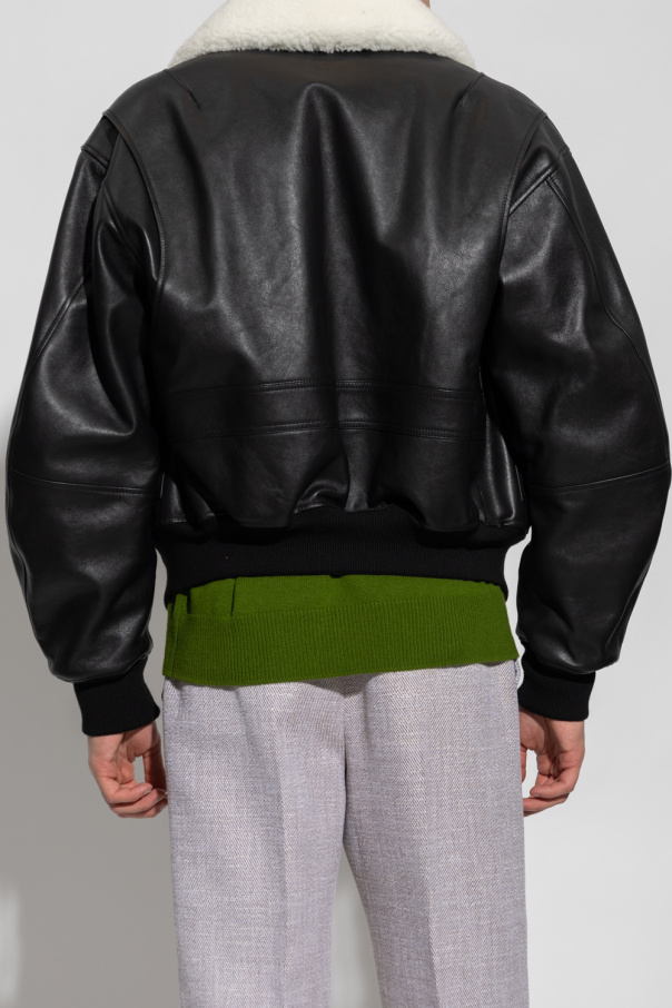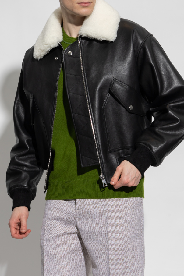 Black jacket from Bottega Veneta. Crafted from leather, this style features a zip fastening, a white shearling collar, two flapped pockets with snaps, a quilted polyester lining and ribbed trims on the bottom hem and cuffs.