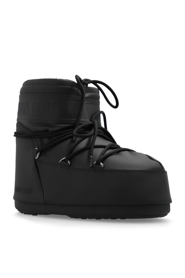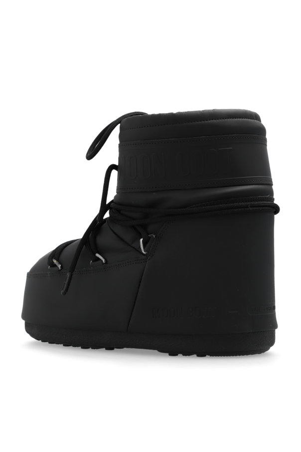 Black ‘Icon Low Rubber’ waterproof snow boots from Moon Boot. Set on a black rubber sole with suction pads that offer serious ground control, this pair features criss-cross tubular laces (not to be used to tighten boots), elasticated cuffs, a tactile logo and silver-tone metal hardware. Inspired by the peculiar shape and technology of the astronauts' boots, the iconic style was designed in 1969 after the first Moon landing.