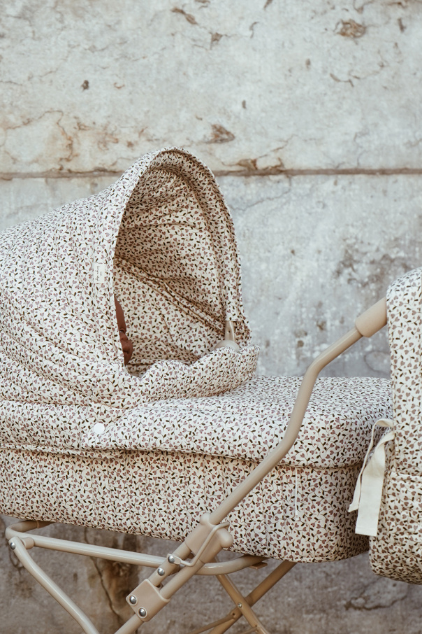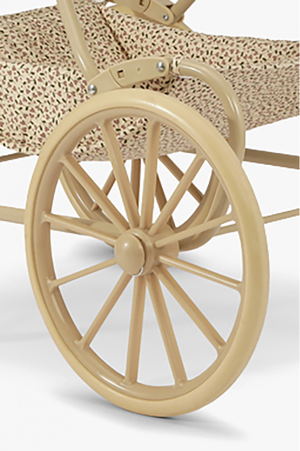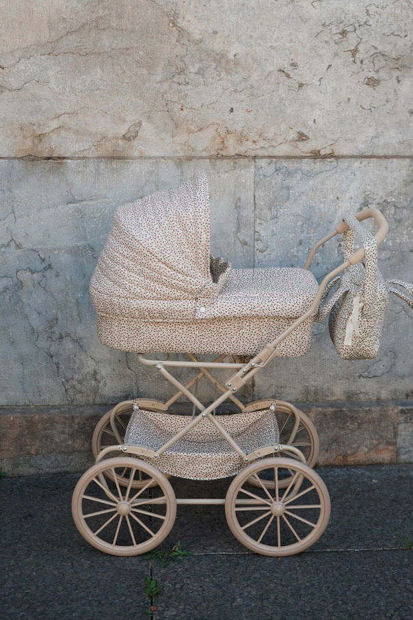 Cream and beige vintage style doll pram from Konges Slojd. Made of EVA. Features quilted printed fabric and a mattress made in 100 percent organic cotton. Designed with a softly cushioned storage basket under the lift. The frame is made of metal with spongy soft handles.