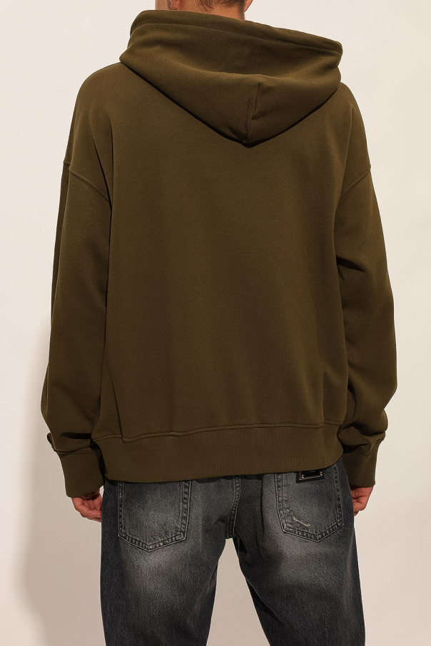 Khaki sweatshirt from Versace Jeans Couture. Made of cotton, this garment features a hood with multicolored drawstrings, neon orange logo print and ribbed edges.