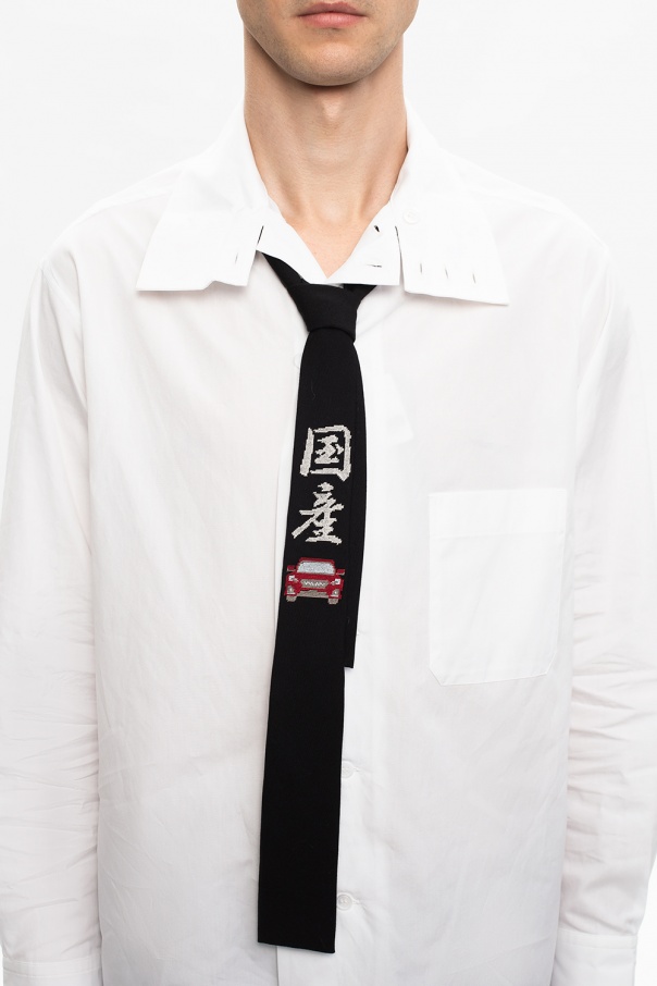 Black tie from Yohji Yamamoto. Crafted from wool gabardine, this accessory showcases embroidered white detail.