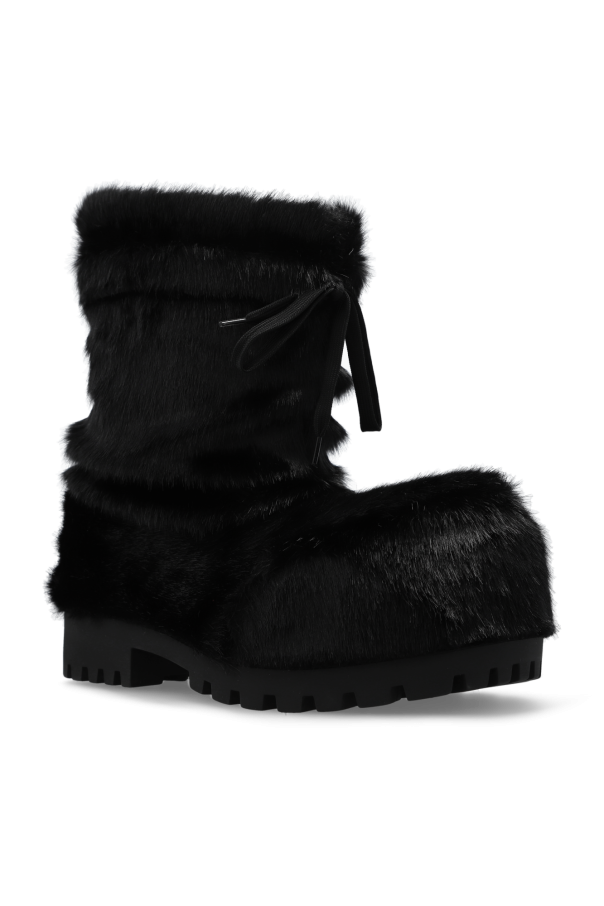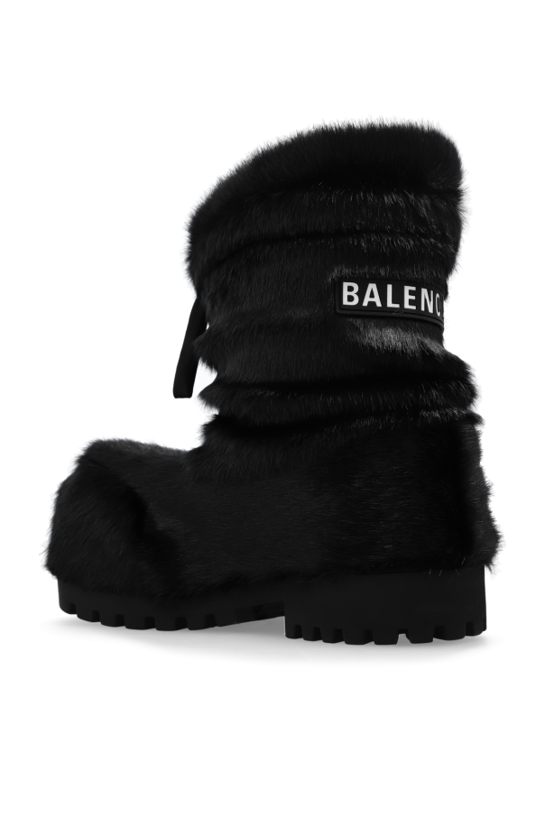 Black ‘Alasca Low’ snow boots from Balenciaga, the ‘Skiwear’ colletion. Made of faux fur, this pair features drawstrings, rubber logo patch in black and white at the back as well as a chunky sole in black rubber.