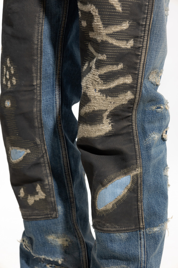 Blue jeans with a vintage effect from Givenchy. Fastened with a hook, button and zip, this pair features dark grey panels, metal logo detail in silver-tone at the back, five slip pockets and straight legs.