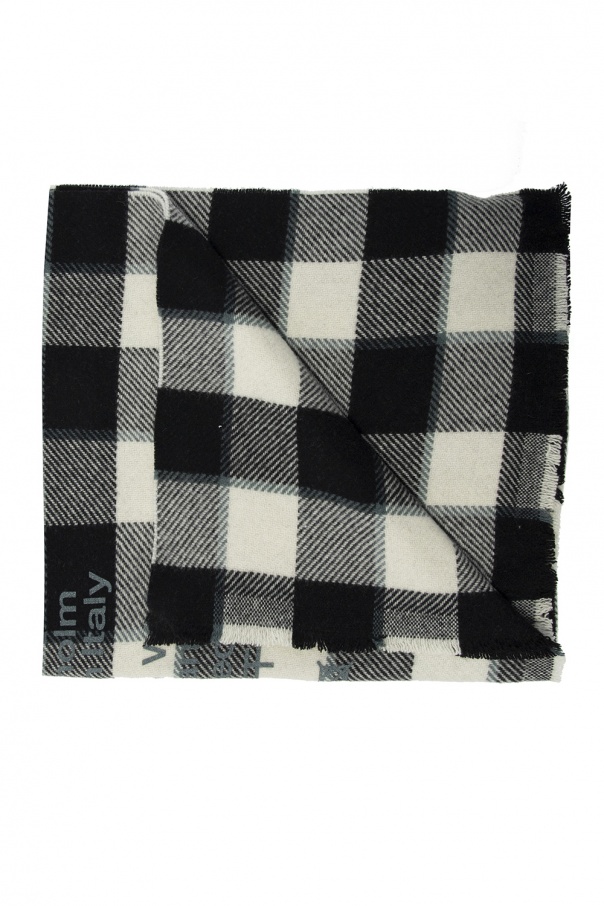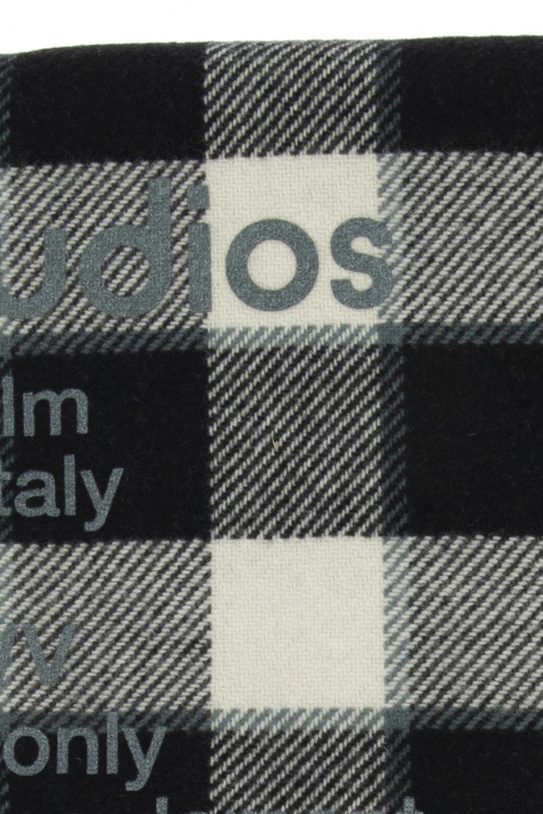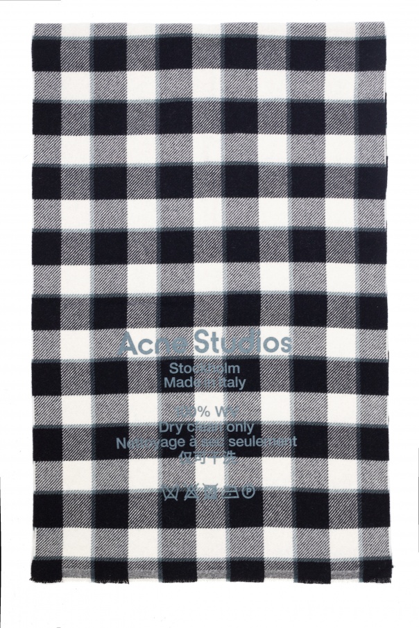 Beige, black and grey scarf from Acne Studios. Crafted from wool, this design is enriched by an embroidered check pattern, white print and fringe ends.