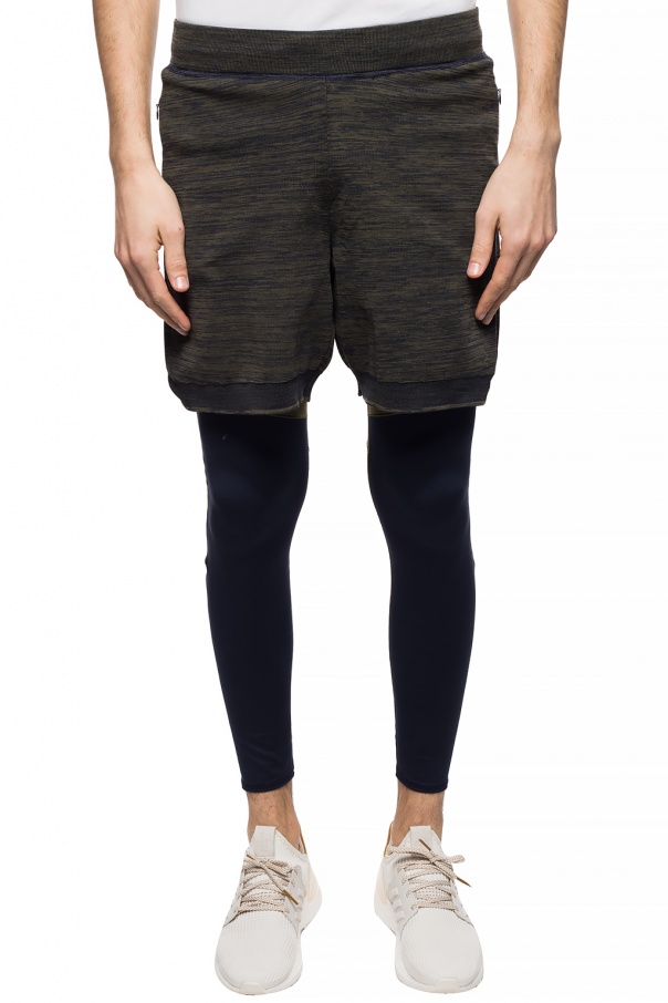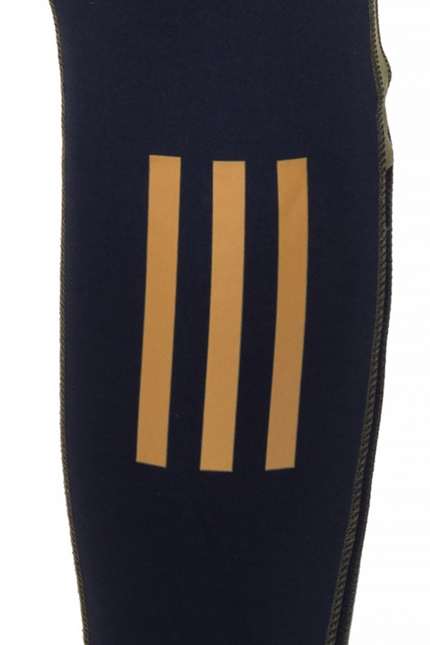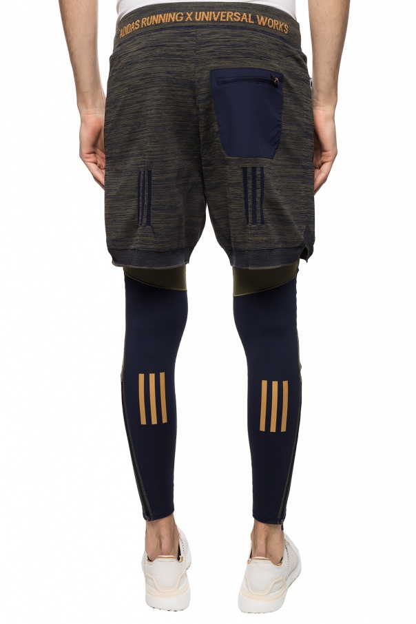 Green, navy blue and brown training leggings from ADIDAS Originals x Universal Works Shorts featuring a drawstring waist, signature three stripes printed on the back and zipped cuffs.