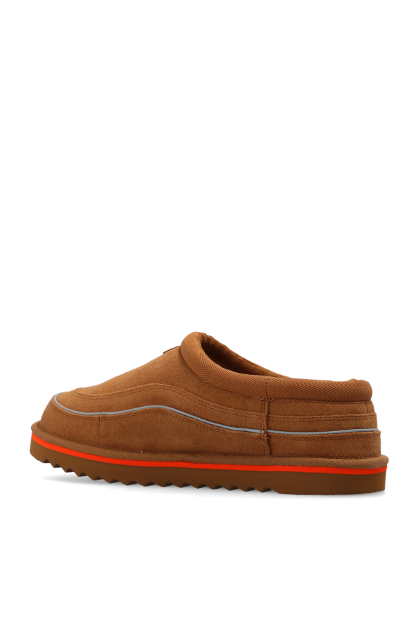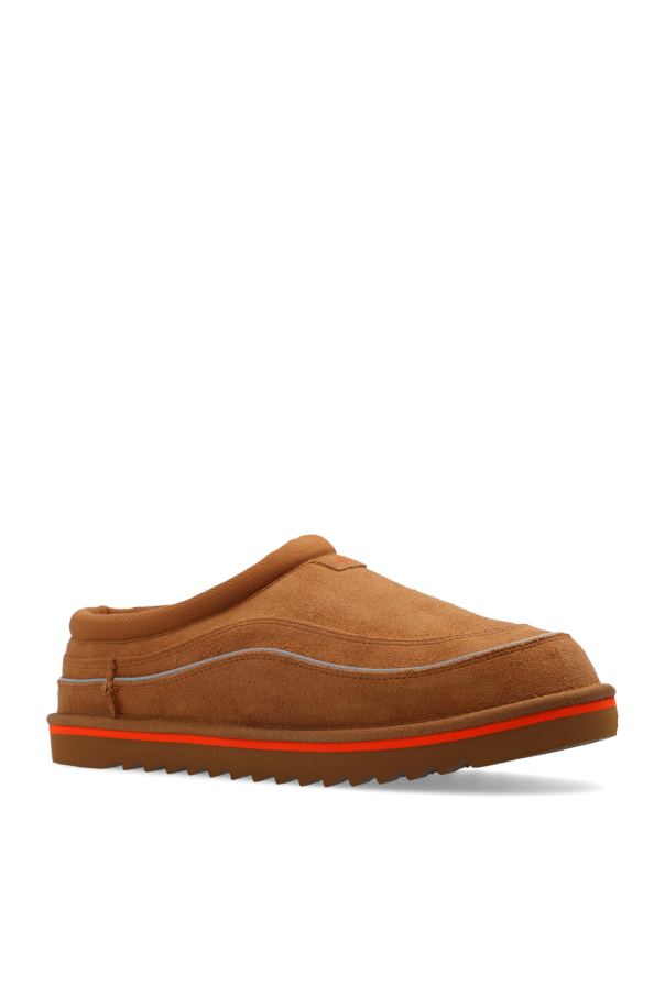 Brown ‘Tasman Cali Wave’ suede slides from UGG. Made from a blend of recycled leather scraps and polyester fibers, this model sits on a brown SugarSole™ EVA outsole which is made from renewable, rainwater-nourished sugarcane and showcases an embossed logo, reflective inserts and the UGGplush ™ trimming.