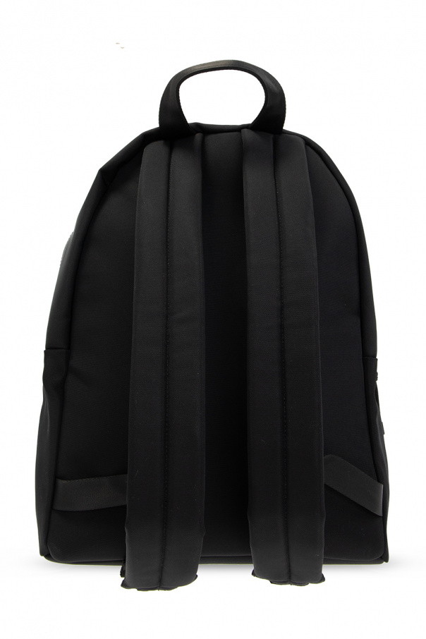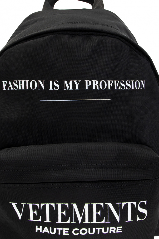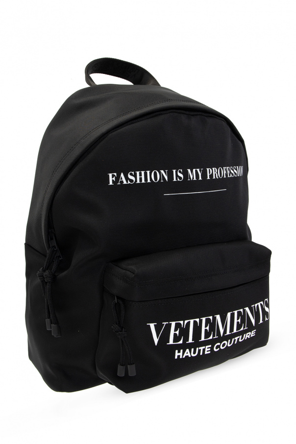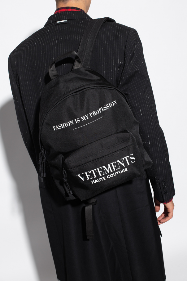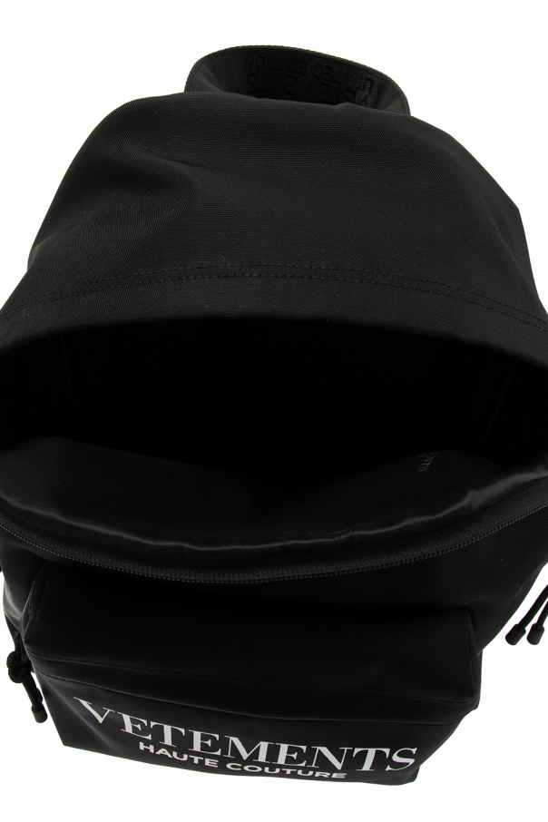 Black backpack from VETEMENTS. Fastened with a two-way zip, this garment features a printed pattern and logo in white, front zip pocket, half-round handle, adjustable shoulder straps and one internal compartment with one slip pocket.