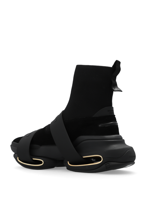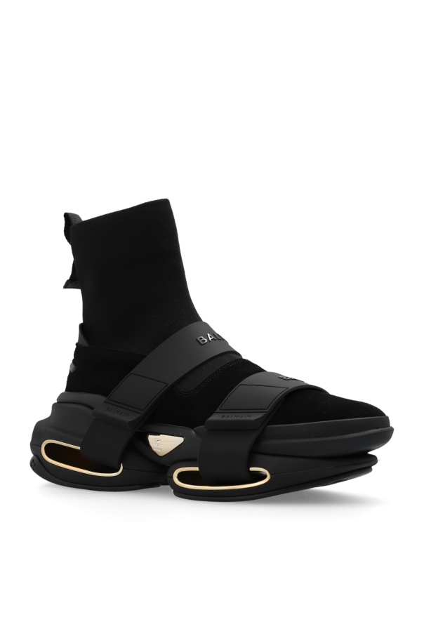 Black high-top sneakers from Balmain. Boasting a slip-on silhouette, this model sits on a black rubber sole and features a velcro closure and a sock hem.